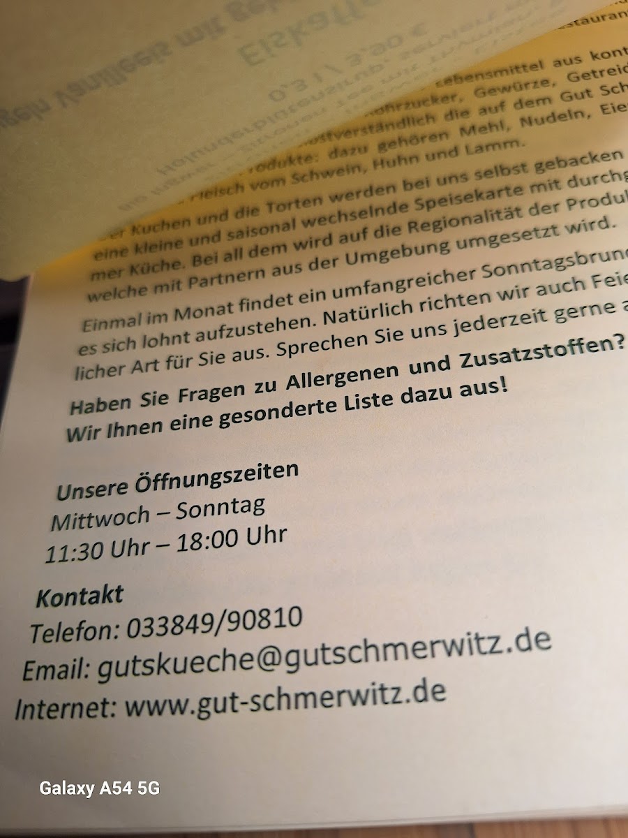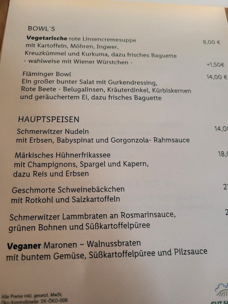 Gutsküche Gut Schmerwitz offers a delightful and varied menu, showcasing a range of comforting and delicious options. The Wildkräuter Salat is a standout dish, offering a fresh and herbaceous combination that perfectly highlights local ingredients. For something a bit heartier, the Lachsbrot is an ideal choice, with its rich and flavorful salmon topping, making it a satisfying yet light option. For dessert lovers, the offerings are truly indulgent, with both the Schokoladenkuchen and Kirschstreusselkuchen providing a sweet conclusion to the meal. The Schokoladenkuchen is a decadent chocolate cake that is rich yet perfectly balanced, while the Kirschstreusselkuchen brings a fruity and crumbly texture, offering a delightful contrast. Together, these dishes create a well-rounded experience that highlights the restaurant's commitment to quality and flavor, making it a wonderful dining destination.